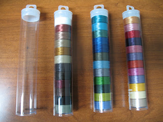 I had to have these tubes of beading thread when I saw them. I loved the colors and I loved the idea of having them contained in one place. There are 12, 75yd bobbins in each container. At $14.95 this seems like a deal. The beading thread is by S-Lon and is suppose to be stronger then Nymo. I haven't tested it - nor will I.